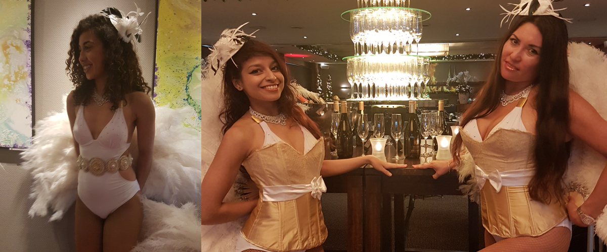 Danseressen, gekleed in champagnekleuren (fizz goud en wit, diamonds en crystal steentjes) ontvangen uw gasten met een goede champagne (champagne tower) en een lekker hapje.